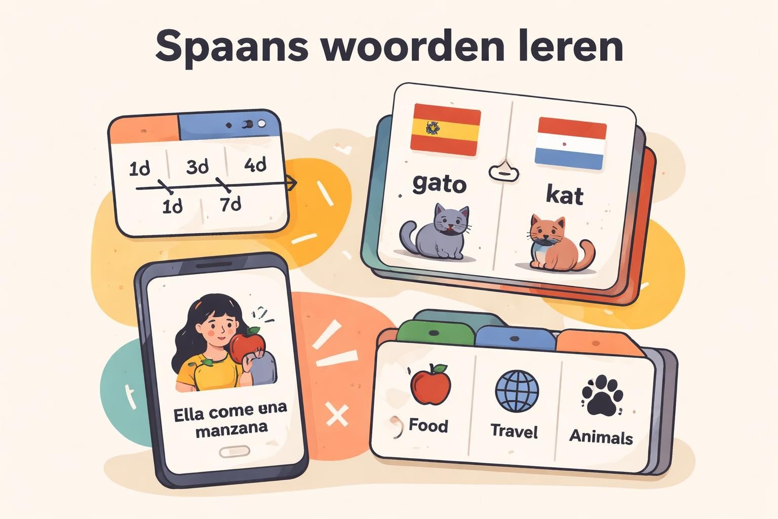 Een veelgemaakte fout bij woordjes leren Spaans is het memoriseren van losse woorden zonder context. Woorden die u leert binnen een betekenisvolle zin of situatie blijven 3 tot 4 keer langer hangen dan geïsoleerde vertalingen.